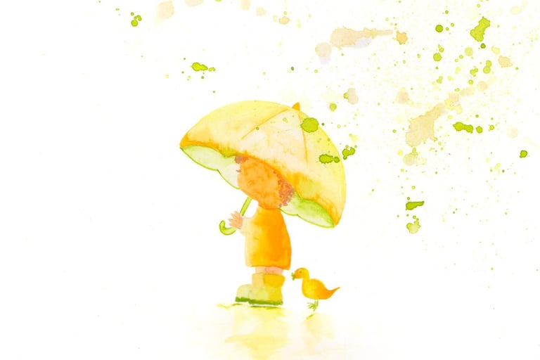 I had stopped working full-time in the Easter of 2025 and started working through the book The Artist´s Way. It is a suggestion/requirement to do 3 pages of writing – the morning pages. As I started to clear some crap from my mind, more and more little kid inspirations came up. Then one day and I have no idea why, I drew a little one with an umbrella and the phrase ¨Be sunny inside even when it´s raining¨ came up. I went with more ideas, mostly based on my personal thoughts and life story and learnings.